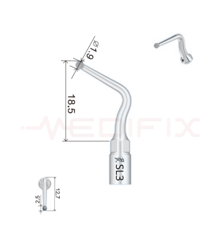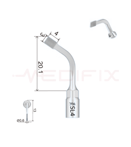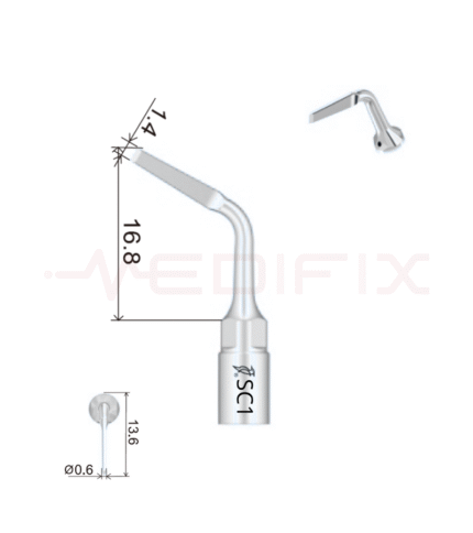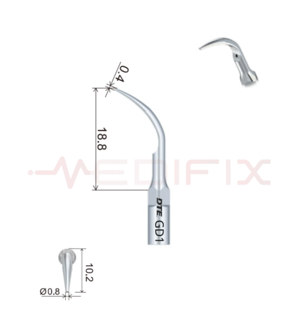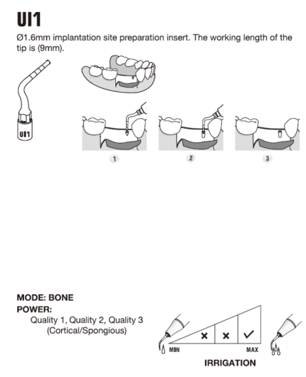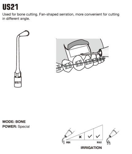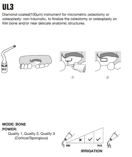 • Recubierto de diamante (100 um) para osteotomía micrométrica: para finalizar la osteotomía cerca del tejido blando (membrana sinusal, vaso, nervio alveolar).
