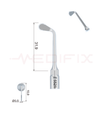• Con revestimiento de diamante (100 um) para osteotomía u osteoplastia micrométrica: no traumático, para finalizar la osteotomía u osteoplastia en hueso delgado y/o de estructuras anatómicas delicadas.