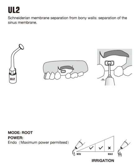 • Ángulo de la punta de 120°, separación de la membrana sinusal en zonas internas, elevador sin cortes de la membrana sinusal.