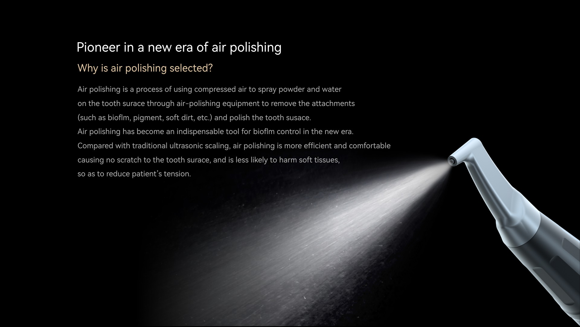 Pulido con aire supragingival, con diseño anti-succión evitando que el polvo y la humedad entren.