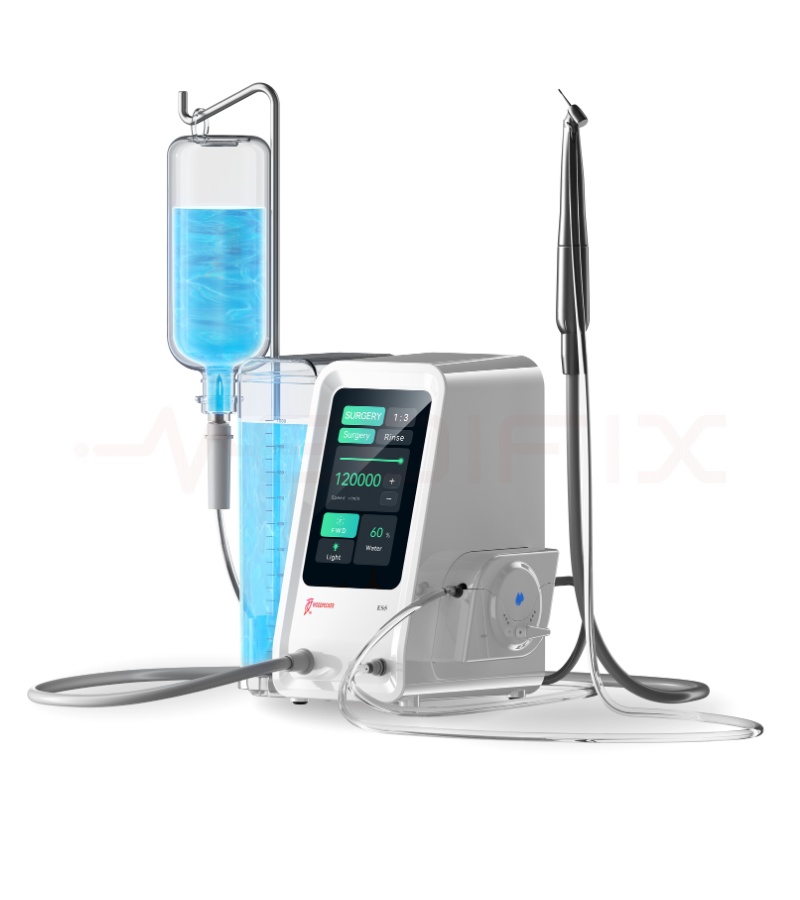 Motor eléctrico dental que se puede utilizar en procedimientos quirúrgicos orales como cirugía periodontal, apical, de implantes y extracción de dientes, se puede utilizar solución salina o agua estériles como refrigerante o irrigante quirúrgico para reducir el riesgo de infección de la herida.