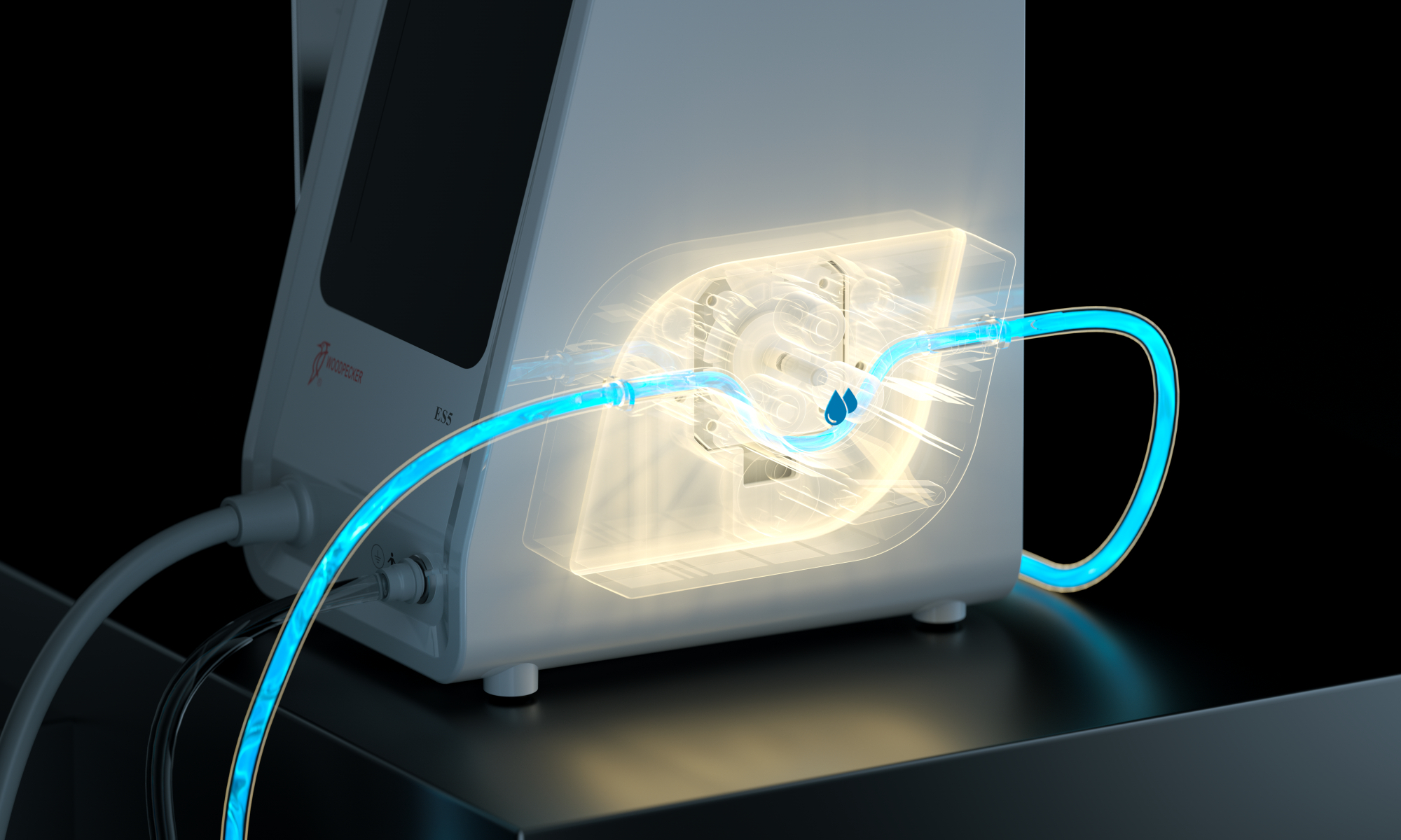 - Sistemas duales de suministro de agua. Sistema 1: Tanque de agua conectado para agua destilada o pura, utilizado con la pieza de mano con canal de agua interno. Sistema 2: Línea de irrigación externa esterilizable o de un solo uso, utilizada con la pieza de mano con canal de agua externo.