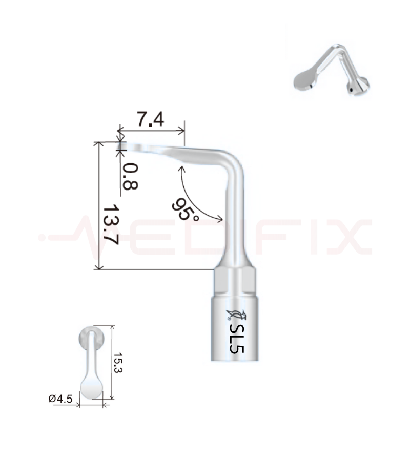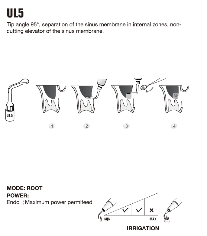 • Ángulo de la punta de 95°, separación de la membrana sinusal en zonas internas, elevador sin cortes de la membrana sinusal.