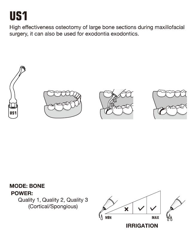 • Osteotomía de alta efectividad de grandes secciones óseas durante la cirugía maxilofacial. También se puede utilizar para exodoncia.