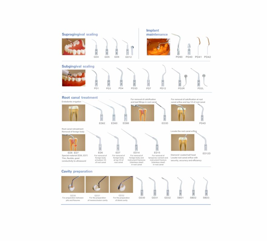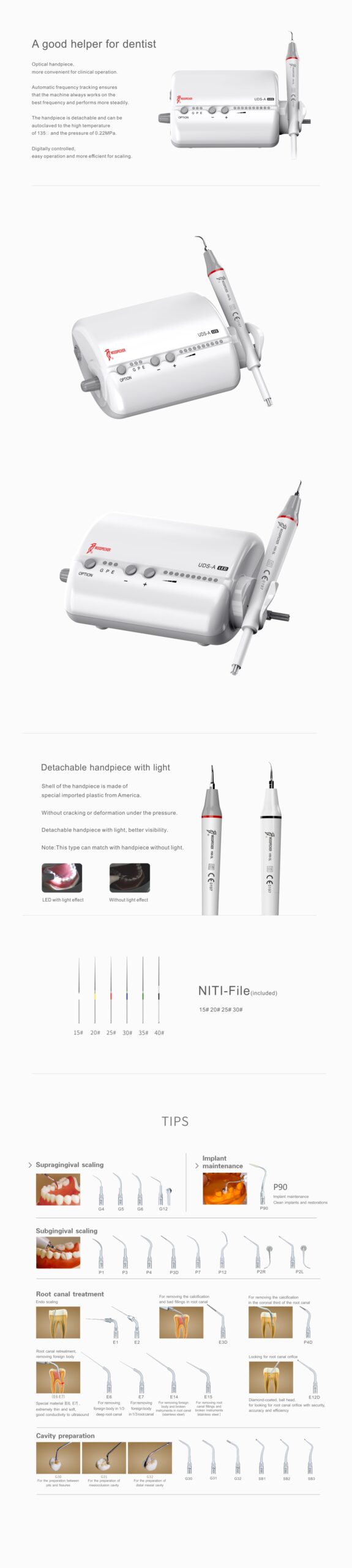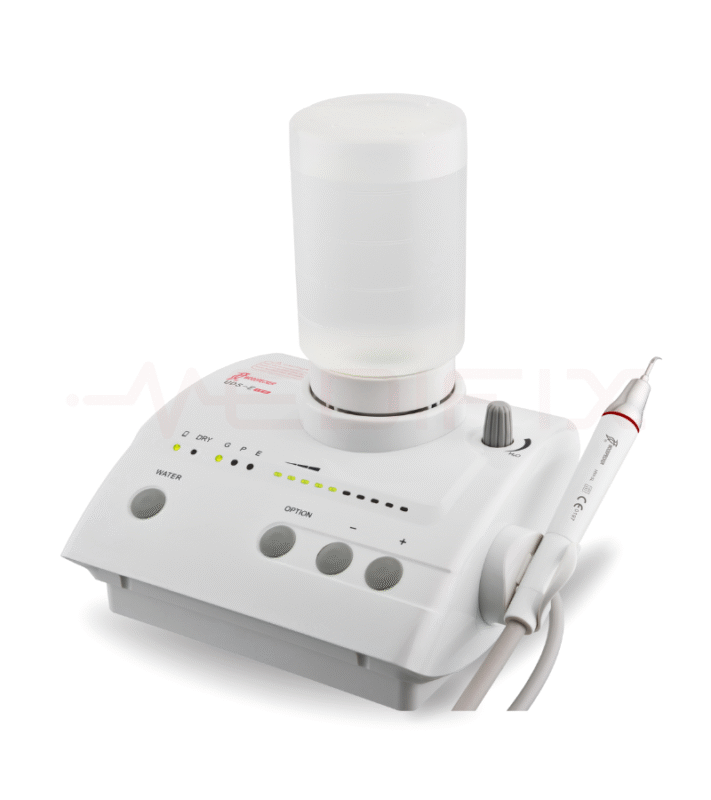 Limpiador ultrasónico que tiene como función la eliminación de cálculos dentales y el tratamiento de conductos radiculares con 3 funciones: scaling, perio y endo. Pieza de mano desmontable y esterilizable en autoclave.