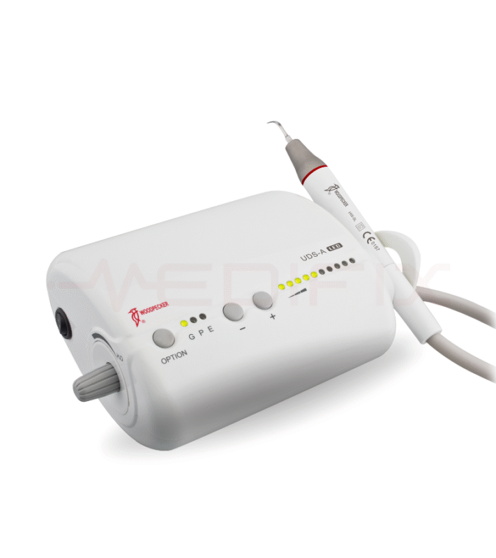 Limpiador ultrasónico que tiene como función la eliminación de cálculos dentales y el tratamiento de conductos radiculares con 3 funciones: scaling, perio y endo. Pieza de mano desmontable y esterilizable en autoclave.