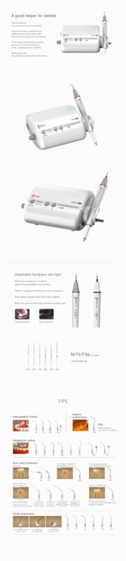 Limpiador ultrasónico que tiene como función la eliminación de cálculos dentales y el tratamiento de conductos radiculares con 3 funciones: scaling, perio y endo. Pieza de mano desmontable y con luz LED, autoclavable.