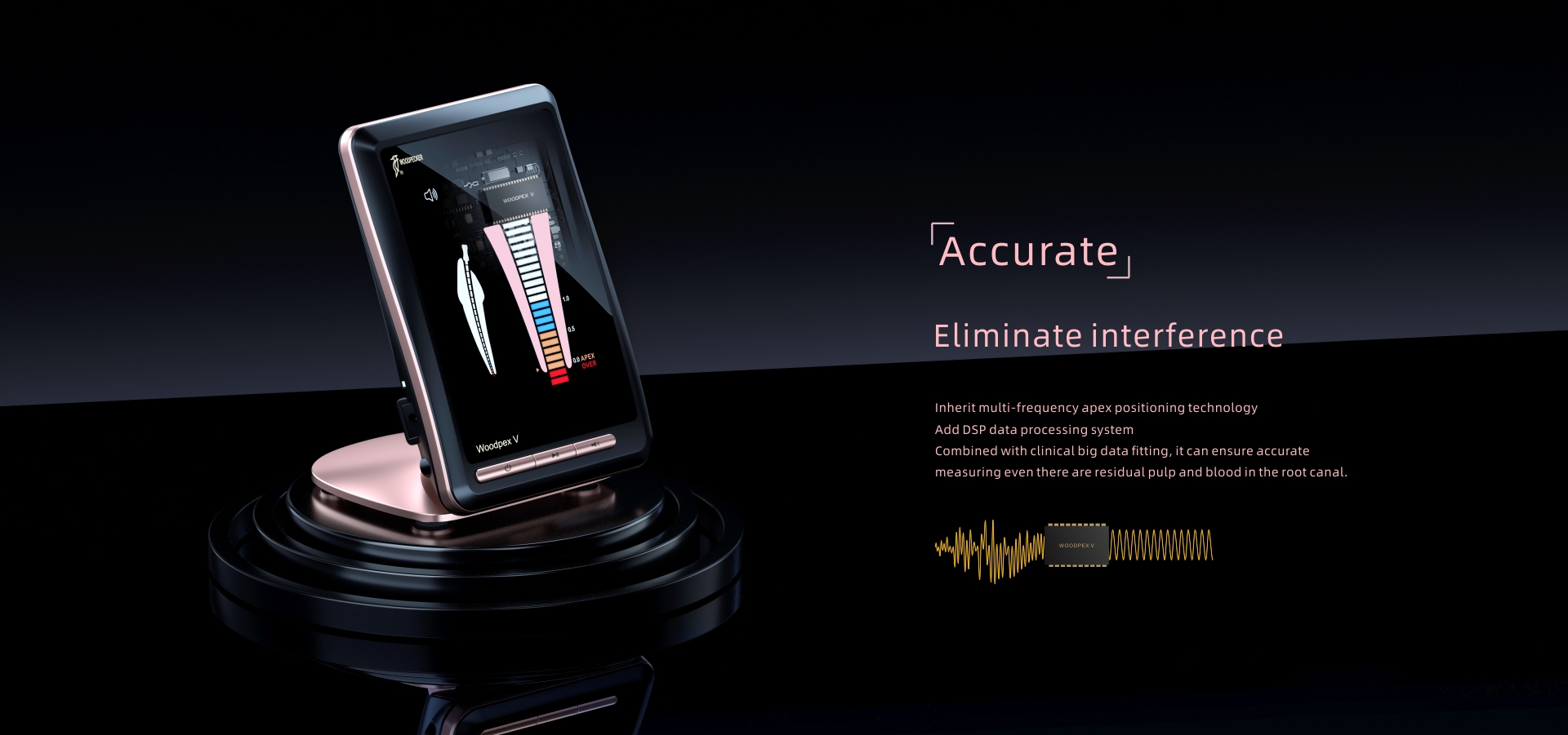 Equipo de medición de la longitud apical. Visualiza la posición de la lima en el conducto radicular. Elimina las interferencias